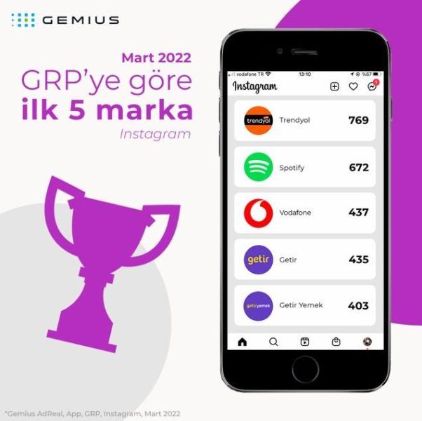 Instagram üzerinden en çok GRP’ye ulaşan ilk 5 markaya gelince… 769 GRP ile Trendyol liste başı olurken, dijital müzik platformu Spotify 672 GRP ile Trendyol’un hemen peşinde yer aldı. Vodafone 437 GRP’ye ulaşırken, Getir 435, Getir Yemek 403, Yemeksepeti.com ise 344 GRP ile bu listenin öne çıkan isimleri oldu.