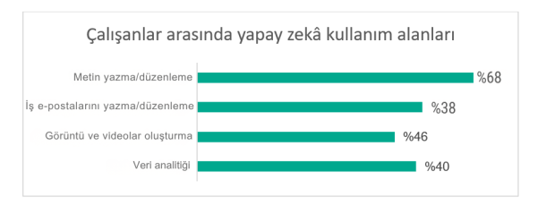 META bölgesindeki Türkiye özelinde katılımcıların büyük çoğunluğu (%95) “üretken yapay zekâ” kavramını bildiğini belirtiyor. Üstelik bu bilgi artık yalnızca teorik düzeyde kalmıyor; YZ araçları çalışanların günlük iş rutinlerinin bir parçası hâline gelmiş durumda. Genel olarak katılımcıların %72’si YZ araçlarını işlerinde kullanıyor. En yaygın kullanım alanları; metin yazımı ve düzenleme (%68), e-posta hazırlama (%38), yapay sinir ağlarıyla görsel veya video üretimi (%46) ve veri analitiği (%40) olarak öne çıkıyor.