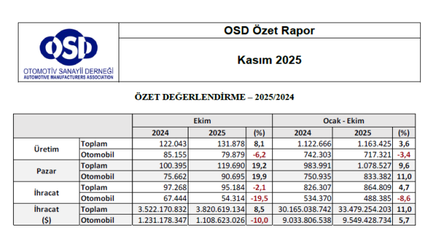 OSD verilerine göre 2025’in ilk 10 ayında toplam otomotiv üretimi, geçen yılın aynı dönemine göre yüzde 4 artarak 1 milyon 163 bin 425 adede ulaştı. Otomobil üretimi ise yüzde 3 düşüşle 717 bin 321 adet seviyesinde gerçekleşti.