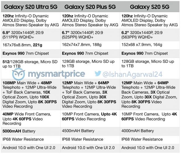 Son rapor, Samsung Galaxy S20, Samsung Galaxy S20 + ve Samsung Galaxy S20 Ultra akıllı telefonların tüm özelliklerini gözler önüne serdi. Daha fazla beklemeden özelliklere geçelim.