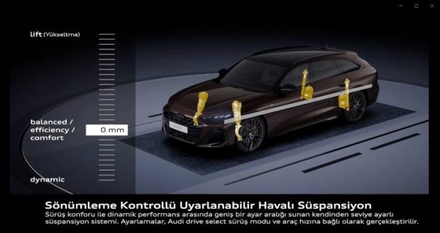 Opsiyonel olarak sunulan Uyarlanabilir havalı süspansiyon, dört tekerlekte elektronik kontrollü amortisörlerle çalışarak hem gövde yüksekliğini hem de süspansiyon karakterini sürekli olarak ayarlıyor. Sistem araç yükünü otomatik olarak dengeleyerek gövdenin her zaman aynı seviyede kalmasını sağlıyor.