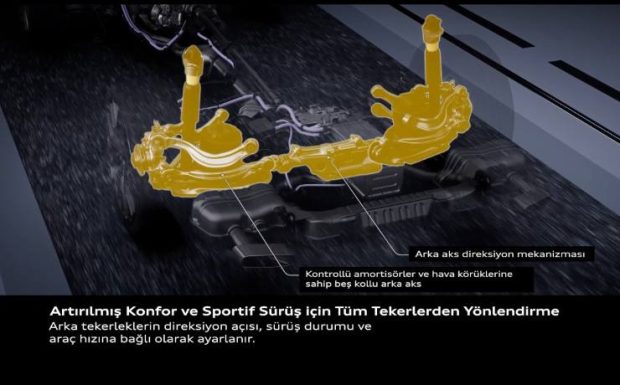 Yeni Audi A6 Avant’ın ön ve arka akslarında büyük ölçüde alüminyumdan üretilmiş beş kollu (five-link) süspansiyon mimarisi kullanılıyor. Ön aks gövdeye sabit şekilde bağlanan bir alt şasiye sahipken, arka aks hidrolik bağlantılı bir alt şasi üzerinden gövdeye entegre ediliyor. Bu yapı hem sürüş konforunu hem de yol tutuş performansını artırıyor.