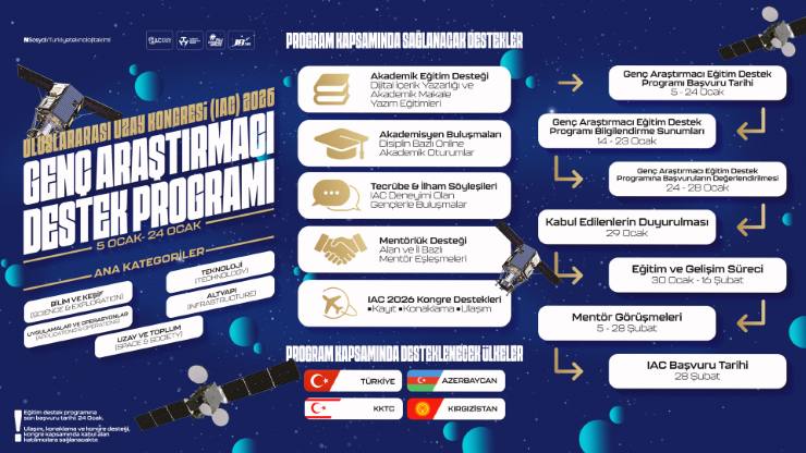 T3 Vakfı tarafından hayata geçirilen Genç Araştırmacı Destek Programı; “Bilim ve Keşif”, “Teknoloji”, “Uygulamalar ve Operasyonlar”, “Altyapı” ve “Uzay ve Toplum” ana kategorileri altında şekilleniyor. Program kapsamında dijital içerik yazarlığı ve akademik makale yazımı eğitimlerini içeren akademik eğitim desteği, disiplin bazlı çevrim içi akademisyen buluşmaları, IAC deneyimine sahip gençlerle düzenlenecek tecrübe ve ilham söyleşileri, alan ve il bazlı mentor eşleşmeleri ile mentorlük desteği sunulacak. IAC tarafından bildirileri kabul edilen katılımcılara ise kayıt ücreti, konaklama ve ulaşım desteği sağlanacak.