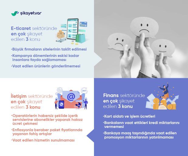 E-ticarette kampanya dönemlerinde yaşanan sıkıntılar, finans sektöründe harcama itirazlarının çok fazla olması, iletişim sektöründe habersiz çekilen ücretler bu yıl en fazla tüketicilerin mağdur olduğu konular arasında yer aldı. Şikayetvar verilerine göre genel olarak 2022’de tüm sektörler düşünüldüğünde tüketicinin en çok dile getirdiği konuysa ciddi bir güven kaybının olmasıydı.